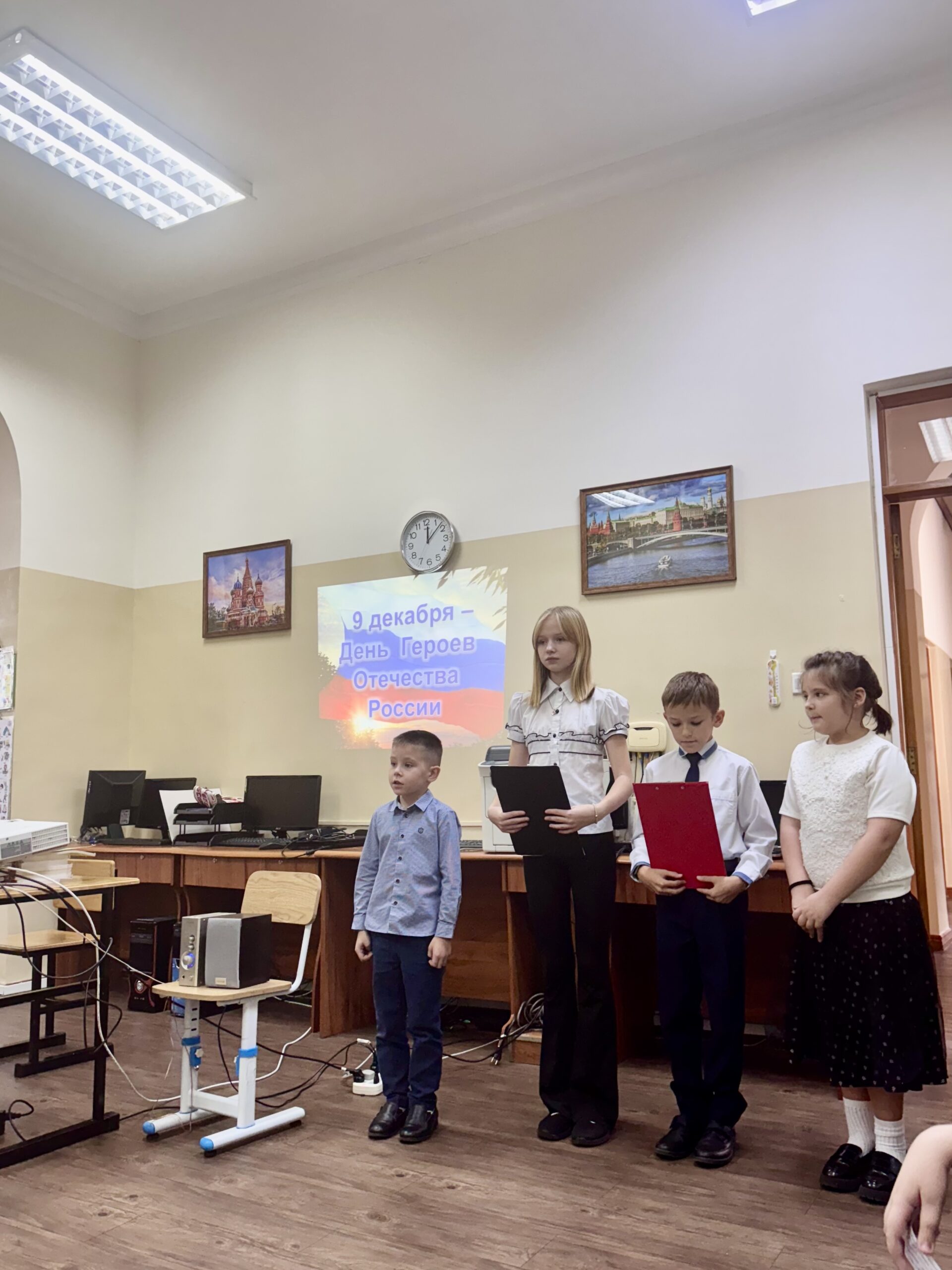 11 декабря в нашей школе учитель Зарецкая И.Л. организовала мероприятие, посвящённое Дню Героев Отечества. Этот праздник объединяет историю воинских подвигов и трудовой славы сегодняшних дней. Мы с особым чувством, чувством почтения и глубокого уважения отмечаем День Героев Отечества. Ведущими праздника стали дети: Дорожкина Мария-Фредерика и Олейников Лев.