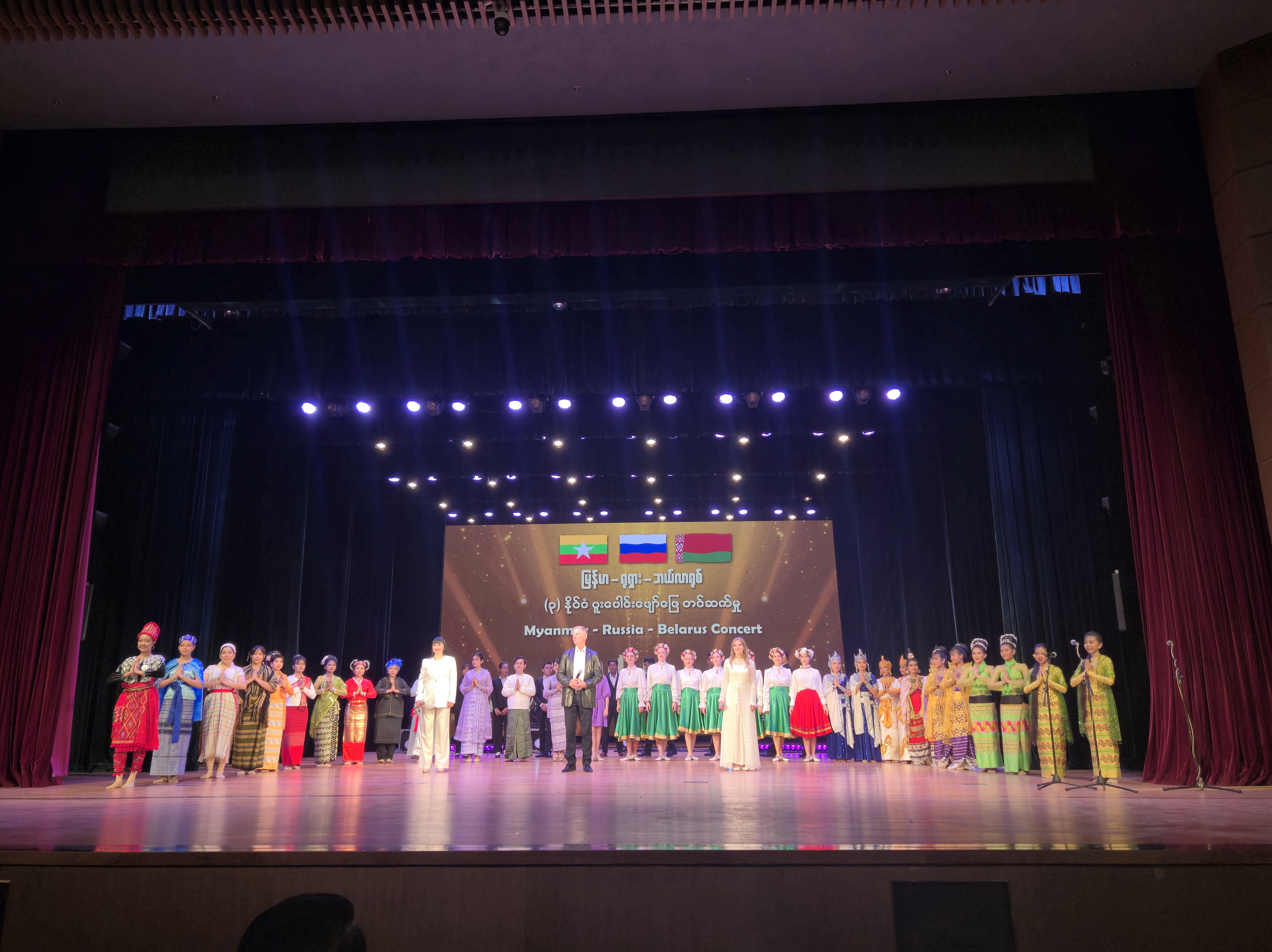 Сцена Национального театра в Янгоне объединила российских, белорусских и мьянманских артистов. 11 октября в Национальном театре Янгона состоялся концерт с участием белорусской музыкальной группы под руководством В.Суколинского, творческого коллектива Посольства России в Мьянме и мьянманских исполнителей. В мероприятии со своим репертуаром выступил танцевальный коллектив «Лебедушка», руководителем которого является учитель школы при Посольстве России в Мьянме Разина А.С. Участницы ансамбля, среди которых учитель начальных классов Шатрова Н.С., представители родительского комитета Войтович А.А., Нестерова Е.В., ученица 11 класса Шатрова Екатерина, сотрудницы Посольства Завьялова А.В., Юнак О.В., представили зрителям уже полюбившиеся танцы «Калинка», «Матушка». Ученица 7 класса Дорожкина Мария-Фредерика исполнила песню «Жаворонок», поразив публику своим невероятным голосом. Музыкальный вечер стал настоящим олицетворением культурного многообразия, каждое выступление сопровождалось бурными аплодисментами. Далее танцевальный коллектив исполнил свои композиции на церемониях совместного культурного выступления в рамках Дней Санкт-Петербурга в Мьянме (13-17 октября). Представления прошли в конференц-зале отеля Лотте (г. Янгон), а также на сцене Государственного политехнического университета в г. Нейпьидо в присутствии лидера Мьянмы старшего генерала Мин Аун Хлайна.